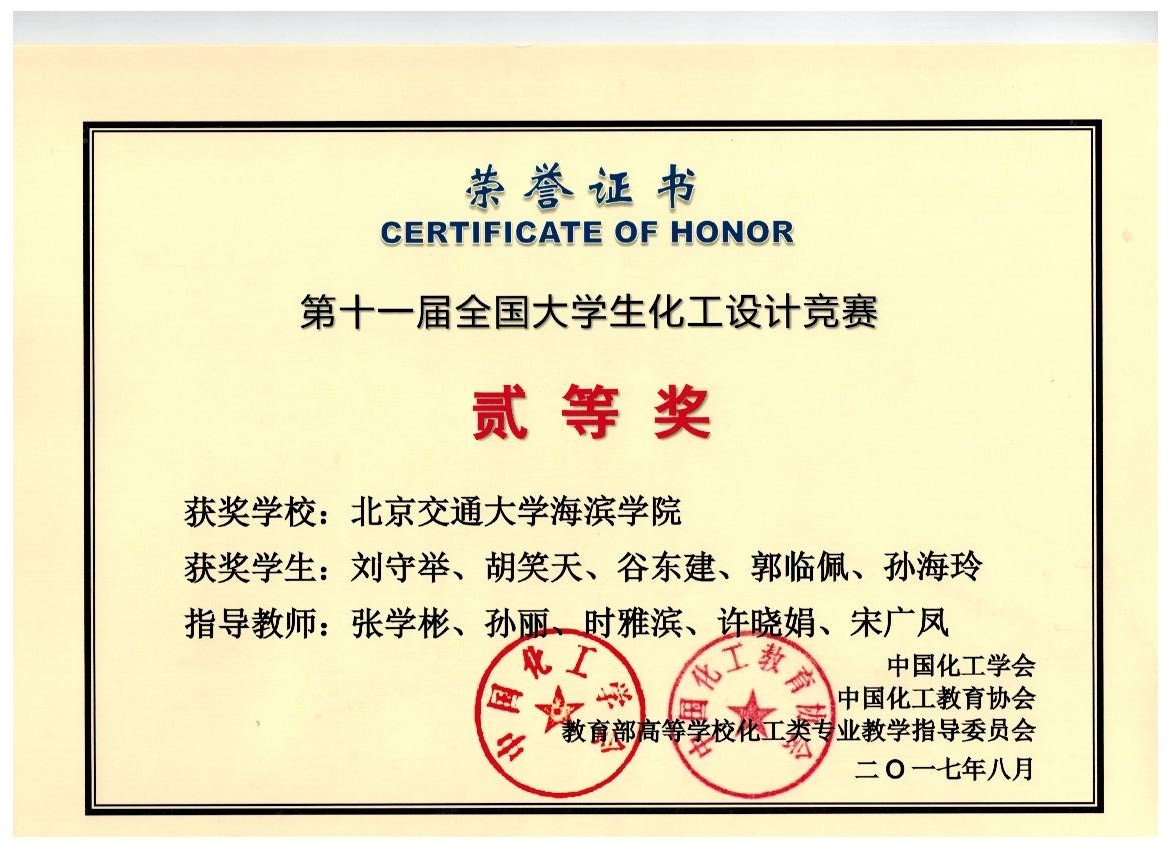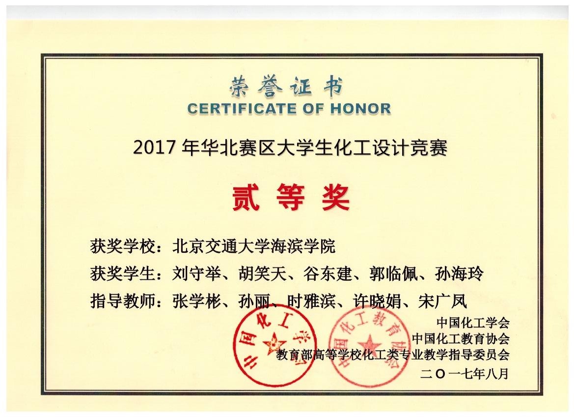 2017年8月3日-5日,由中国化工学会、中国化工教育协会、教育部高等学校化学工程与工艺专业教育指导分委员会联合主办,北京化工大学承办的2017年“东方仿真杯”第十一届全国大学生化工设计竞赛华北赛区竞赛在北京化工大学隆重举行。由太阳官网化学工程系的张学彬、孙丽、时雅滨、许晓娟、宋广凤老师指导的团队(刘守举、胡笑天、谷东建、郭临佩、孙海玲)在华北赛区取得赛区二等奖,经不懈努力最终荣获全国化工设计大赛二等奖。与此同时,我院参加化工设计大赛的另外两支由贾婷、焦帅为队长带领的队伍同样获得了优异的成绩。