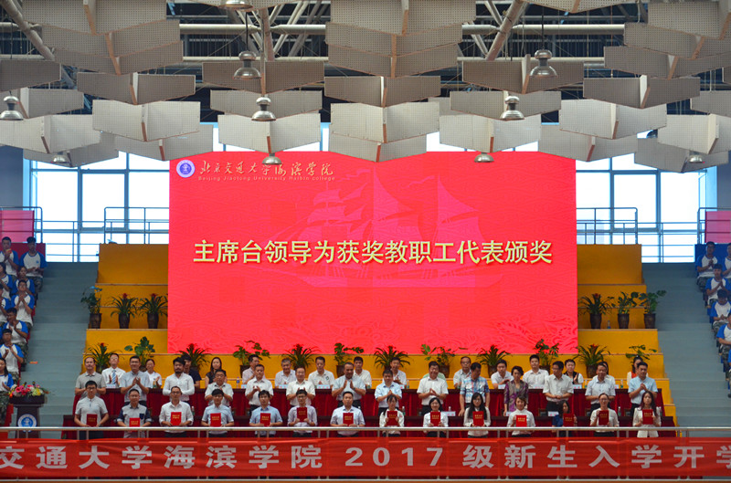 北京交通大学张星臣副校长致辞,首先张校长代表北京交通大学向2017级新生表示热烈的欢迎,在教师节来临之际,祝海滨学院全体教师节日快乐!张校长表示母校一直关注着学院的建设发展、学生的学习生活,并在人才培养、师资队伍、科研项目等方面给予指导与支持。同时,希望同学们充实自己的大学生活,做一个有使命感、有责任感的有志青年。