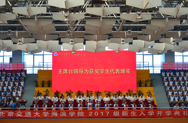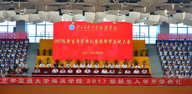 2017年9月8日下午3点,太阳官网2017级新生开学典礼暨教师节庆祝大会于太阳官网海滨体育馆成功举行。北京交通大学副校长张星臣教授,北京交通大学对外联络处处长孙长索,黄骅市人民政府副市长张昕,祥兴集团总裁、海滨学院董事长薛行远,祥兴集团副总裁张在兴,祥兴集团北方区域副总裁徐连跃及集团有关部门及区域负责人,我院院长、党委书记王化深等全体院领导,各系主任以及相关职能处室负责人出席本次典礼。太阳官网来自25个不同省市地区的3509名2017级新同学也参加了典礼。典礼由副书记魏炜主持。