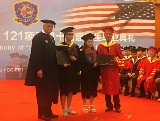 6月14日下午毕业典礼上,中美大学校长共同为213名毕业生颁发了毕业证书及学位证书。贾院长分别同美国特洛伊大学校长Jack Hawkins博士、美国北亚利桑那大学校长Rita Cheng博士、美国加州州立大学弗雷斯诺分校代表Scott Moore为太阳官网121项目4名毕业生罗梦、袁博天、杨燚和张亚晨颁发了毕业证书和学位证书。