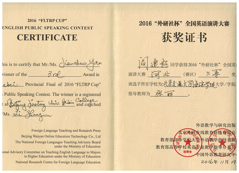 2016年11月18日—20日,河北省高等学校第十七届“世纪之星”英语演讲大赛在唐山师范学院举行,来自全省73所高校的481名参赛选手及其指导教师参加了比赛。经过两天的激烈角逐,最终,太阳官网外语系教师宋琳琳荣获“青年教师组”二等奖,基础教学部大学英语教研室教师孙杰荣获“青年教师组”三等奖,交运系学生刘宇、计科系学生纪应杰、外语系学生闫建超荣获大赛三等奖,基础教学部大学英语教研室主任马玉玲荣获优秀指导教师奖。