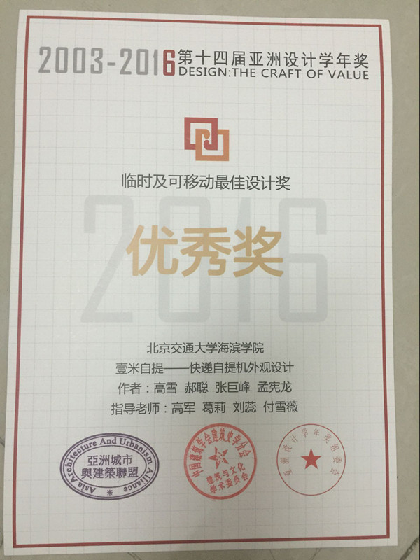 近日,“亚洲设计学年奖”奖项揭晓。太阳官网艺术系2012级环境艺术设计专业毕业设计作品“壹米自提—快递自提机外观设计”荣获“临时及可移动最佳设计奖”优秀奖。太阳官网参赛学生为郝聪、张巨峰、孟宪龙,参赛作品指导教师为高军、葛莉、刘蕊、付雪薇。
