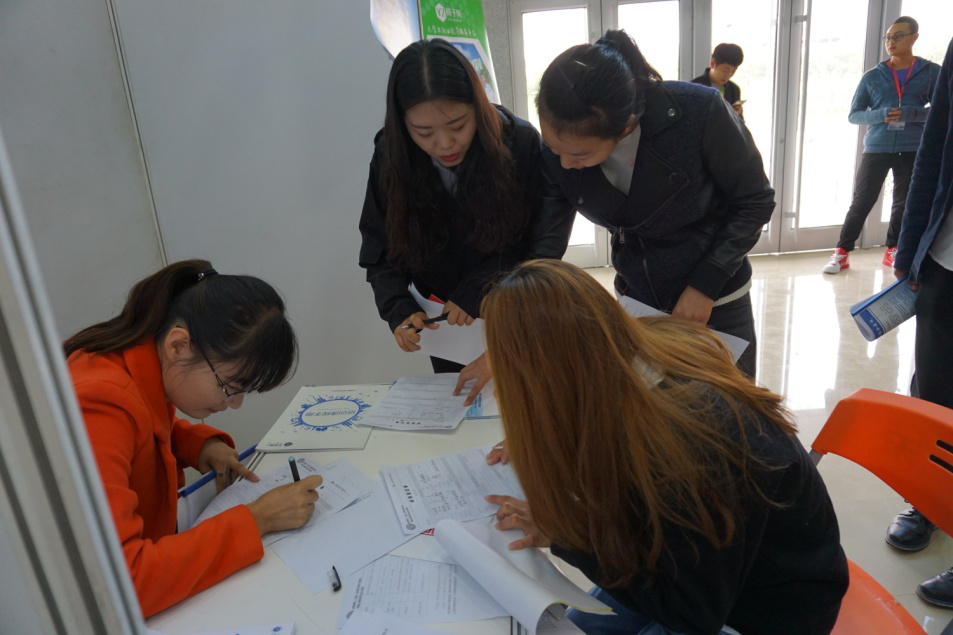会前,各项工作准备就绪,2017届毕业生有序入场,双选会现场人员火爆,各展位前应届毕业生摩肩接踵,纷纷与招聘专员交流、咨询,同时,众多学生都向自己满意的单位投递了简历。