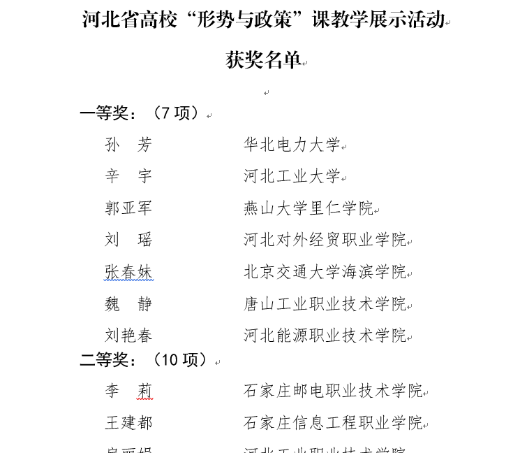 据悉,本次河北省高校“形势与政策”课教学展示比赛由河北省教育厅举办,旨在有效深化“形势与政策”课教学改革,发现培养一批优秀骨干教师。全省各高校高度重视,积极响应,活动共征集到来自全省高校“形势与政策”课教学活动展示作品86项,经组织专家评审,共评选出一等奖7项、二等奖10项、三等奖17项。