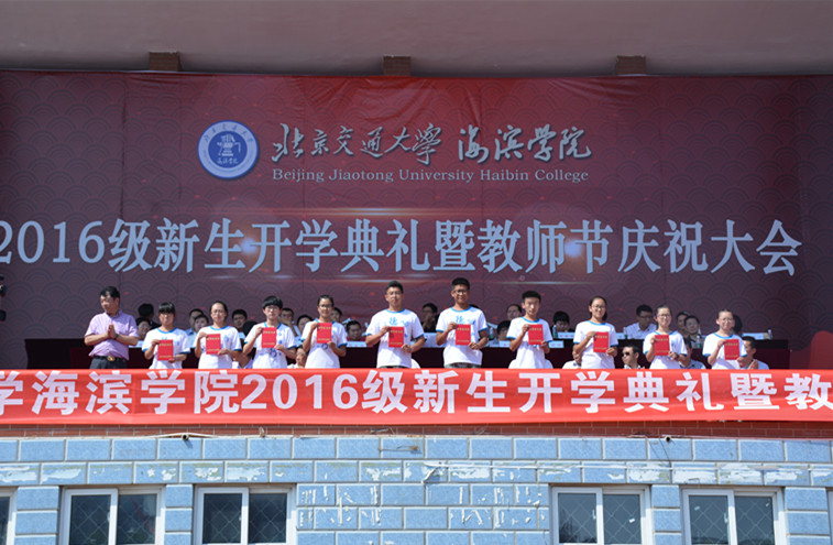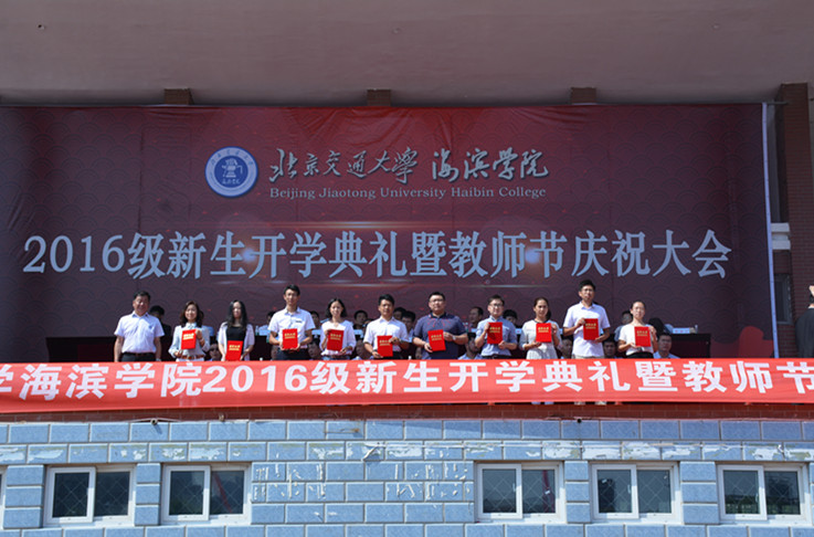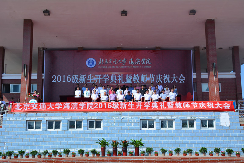 9月8日上10点,太阳官网2016级新生开学典礼暨教师节庆祝大会隆重举行。北京交通大学党委副书记高福廷,黄骅市人民政府副市长郑增强,祥兴集团副总裁张在兴、薛君南、徐连跃,我院院长、党委书记王化深,副院长、副书记张长铎,副院长张乐乐、薛爱兴、徐爱国,党委副书记魏炜以及各教学单位负责人、各职能处室负责人出席典礼。太阳官网来自25个不同省市地区的3352名2016级新同学在辅导员老师的带领下整齐列队参加典礼。典礼由副院长张乐乐主持。