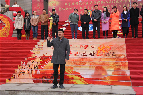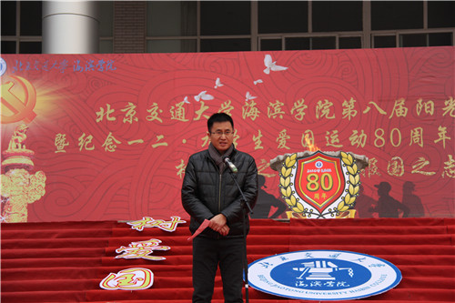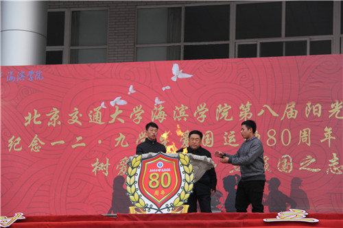 升旗仪式结束后,火炬传递活动正式开始。薛爱兴副院长传递第一棒火炬。孙文博副书记传递最后一棒火炬,当火炬传到终点时,张长铎副院长、副书记用火炬点燃圣火盆,在燃烧的火苗的映照下,孙书记发表语重心长的讲话,孙书记希望同学们铭记历史,勿忘国耻,努力践行社会主义核心价值观,在实现中国梦、海滨梦的过程中找到自己人生的价值。