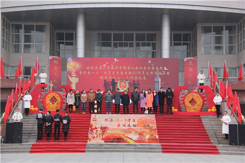 升旗仪式上,我院国旗班队员踏着整齐的步伐,将国旗护送至升旗台,解旗、挂旗后,全体师生高唱国歌,伴随庄严肃穆的注目礼,仰望着五星红旗冉冉升起。随后,同学们在小广场上表演话剧,再现当年学生抵抗侵略的历史场景。