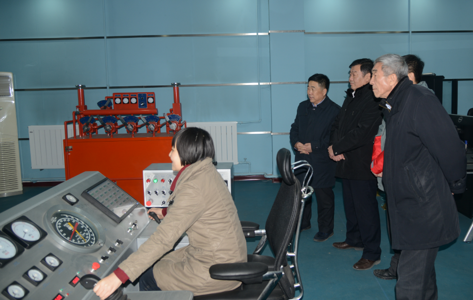在井控培训中心,工作人员为我院领导介绍井控模拟仪器特点并现场模拟操作。