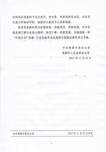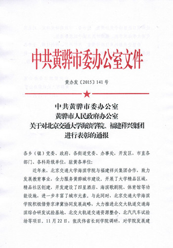 近日,我院受到黄骅市委、市政府的通报表彰。表彰文件中,黄骅市委、市政府充分肯定了我院在发展教育事业,开发建设海滨歌剧院、体育馆和四星酒店等功能设施,响应京津冀协同发展战略,大力推进北交大轨道交通海滨综合研发实验基地项目等方面作出的贡献。我院也将以此为契机,努力发挥优势,在助推黄骅市打造沿海率先发展增长极方面发挥更大的作用。
