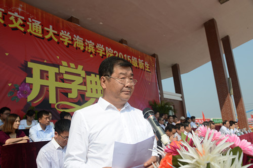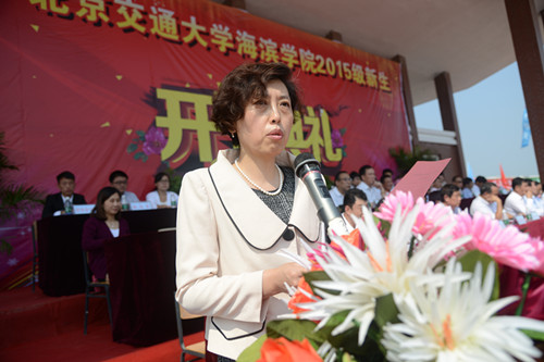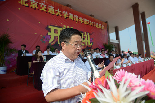 北京交通大学党委副书记高福廷代表北京交通大学致辞。他表示,北京交通大学将一如既往地支持学院办学,全面提高学院的人才培养质量。他希望我院2015级新同学谨记“进德修业,知行合一”的校训,学会自立,自律,自强。