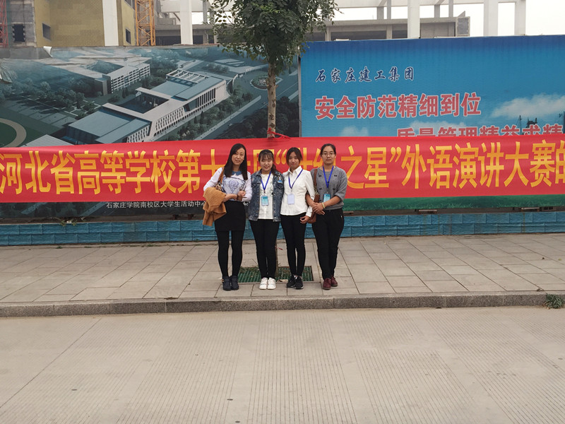 2015年10月17-18日,河北省高等学校2015年第十六届“世纪之星”外语演讲大赛在石家庄学院举行。来自全省116所高校共计395名选手参加了此次比赛。我院外语系张娜和陆朝霞老师带队,英语专业2013级孙艺瑄同学、2014级王然同学参赛。经过复赛和决赛的激烈角逐,我院师生展示出了扎实的英语功底和良好的精神风貌。最终,我院孙艺瑄同学获得英语专业组二等奖,王然同学获得英语专业组三等奖,陆朝霞老师获得青年教师组三等奖。
