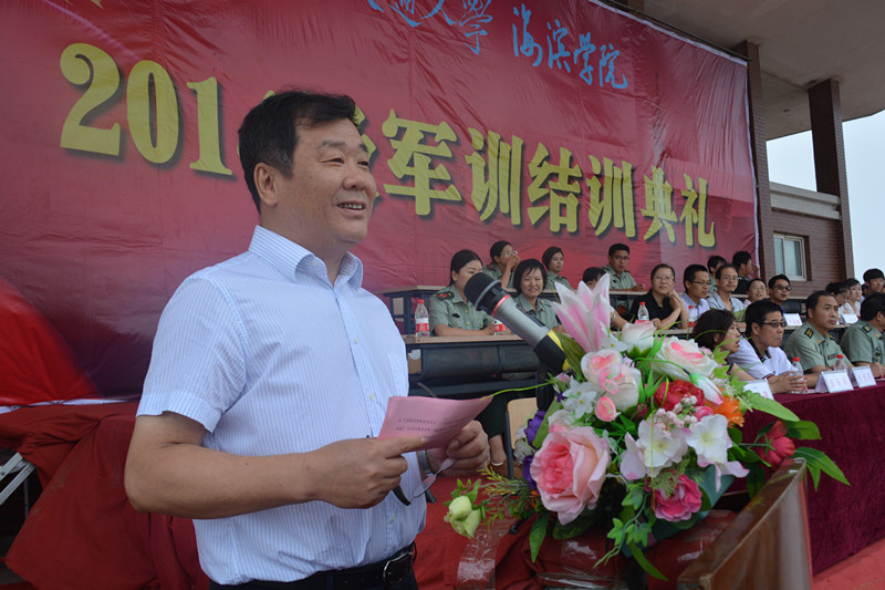 2015年7月16日早7点,我院举行了2014级军训结训典礼。黄骅市市委常委武装部部长庞玉发上校、黄骅市武装部政委李英上校、黄骅港边防检查站副站长史会彬中校,我院全体院领导,北京军区驻北京交通大学选拔培养办公室北京交通大学海滨学院军训团团长倪立萍中校,各系主任助理,各系团委书记,以及军训团各营长、教导员出席典礼。结训典礼由军训团政委、院团委书记黄璐璐主持。