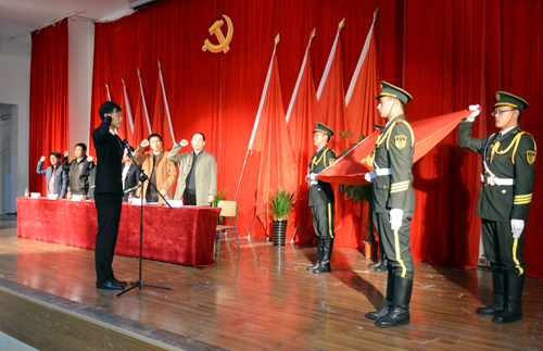 会上,全体师生党员自行佩戴党徽,并集体面对党旗宣誓,重温入党誓词。