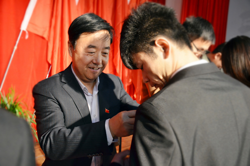 接着,院领导、党委委员为师生党员代表佩戴党徽,为学生党员宿舍颁发标牌。
