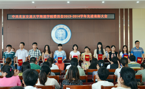 首先,副书记孙文博对2013-2014学年我院党建工作进行了全面总结。接着,副书记、副院长张长铎宣读了《中共北京交通大学海滨学院委员会关于对学院党建工作先进集体和先进个人表彰奖励的决定》。随后,党委委员、副院长徐维祥为3个先进基层党支部代表颁奖;党委委员、学院办公室主任任福义为13位优秀党务工作者颁奖;党委委员、人事处处长翟怀远为29位优秀党员颁奖。会上,化学工程系党支部书记孙丽老师、交通运输系学生党支部副书记杨鹏龙同学分别代表优秀党务工作者和优秀党员发言。