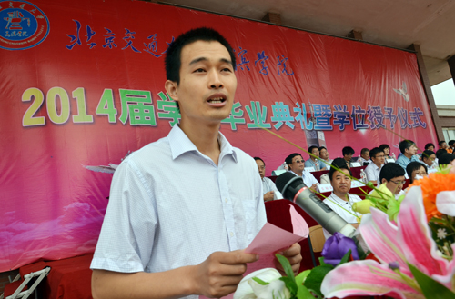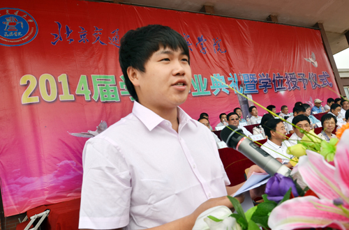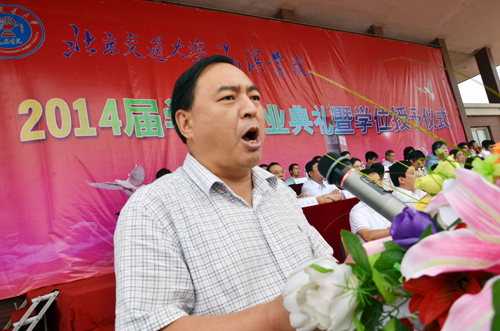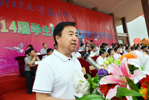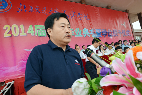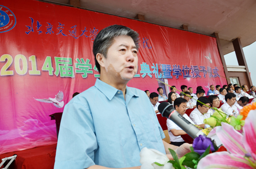 北京交通大学党委副书记、我院院长高福廷在毕业典礼上发表讲话。高院长首先代表学院全体师生员工向圆满完成学业的2014届2465名毕业生表示热烈的祝贺。高院长全面总结了四年来学院快速健康发展所取得的优异成绩,并深情回顾了2014届毕业生与学院共同进步的成长印记。最后,高院长向2014届毕业生提出三点希望:一是要诚实守信做一个优秀的守德者,二是要脚踏实地做一个进取的实干者,三是充满自信做一个勇敢的开拓者。