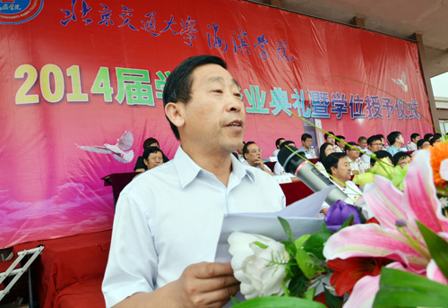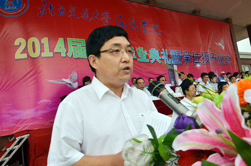 6月21日上午7:00,北京交通大学海滨学院2014届毕业典礼在学院体育场隆重举行。北京交通大学党委副书记、我院院长高福廷,黄骅市委常委、市委办公室主任张剑华,黄骅市人民政府副市长郑增强以及北京交通大学相关职能部处及学院负责人,我院投资方和校企合作企业的代表等领导及嘉宾出席毕业典礼并在主席台前排就坐。我院全体院领导,各职能处室负责人、教学单位负责人及各专业负责人,教师代表、家长代表、在校生代表和全体毕业生参加毕业典礼。毕业典礼由我院执行院长王大勇主持。