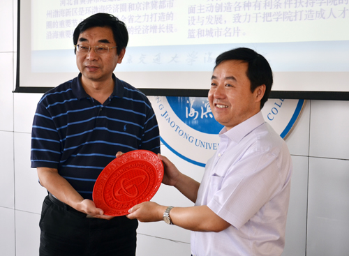 5月10日上午,北京信息科技大学党委副书记杨军带领基建处、新校区建设指挥部相关负责人一行7人访问我院。北京交通大学党委副书记、我院院长高福廷,我院执行院长王大勇、副院长薛爱兴、党委副书记孙文博以及黄骅华城房地产开发有限公司总经理张如珠、副总经理丁春国等领导接待了北京信息科技大学的客人。