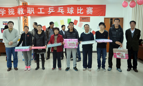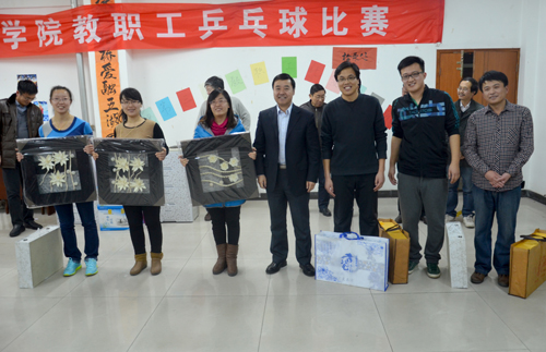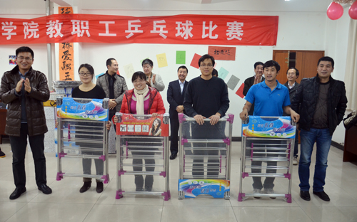 首先,工会副主席尹鸿峰宣布了第三届教职工乒乓球比赛结果:基础教学部大学体育教研室、保卫处、机械与电气工程系荣获男团比赛前三名;基础教学部大学物理教研室、大学数学教研室、大学体育教研室与大学英语教研室联合代表队荣获女团比赛前三名;祁中林、曹智、荆树杭、吴立军、彭一腾、马群、商全乐、时国松分获男单比赛前八名;黄璐璐、安玉冉、满鹤楠、王兰、刘雪华、李策、张晓芳、德新玲分获女单比赛前八名。接着,院领导分别为获奖团体和获奖个人颁发了丰厚的奖品。