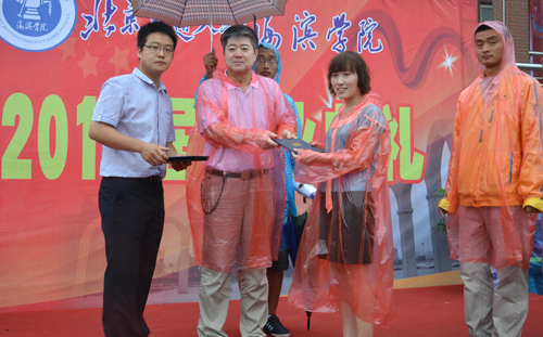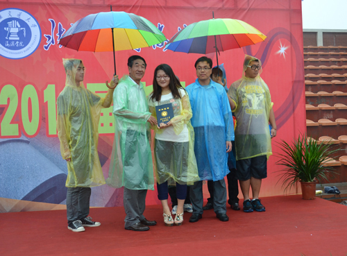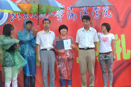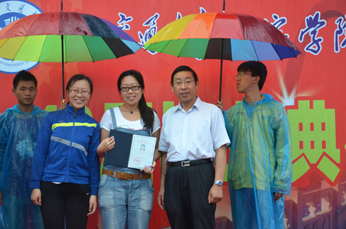 6月22日上午,2013届毕业生毕业典礼在完成领导讲话、师生代表发言和颁奖环节之后,我院领导冒着小雨为毕业生一一颁发毕业证书。