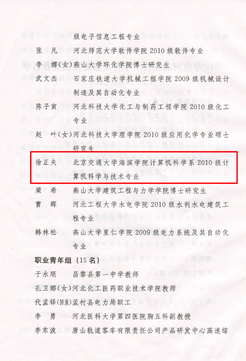 近日,在团省委、省科技厅联合开展的2012年度“河北省青少年科技创新奖”评选活动中,我院计算机科学系计算机科学与技术专业2010级学生徐正夫喜获“河北省青少年科技创新奖”。