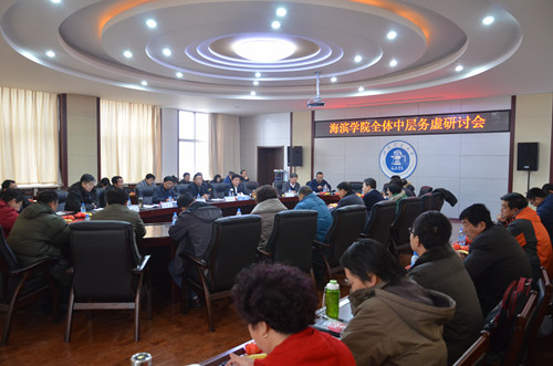 1月12日,我院在行政楼五楼新会议室召开2013年全体中层以上干部务虚研讨会。全体在院领导,各系部主任、专业负责人、责任教授,各职能处室负责人以及各系主任助理出席会议。