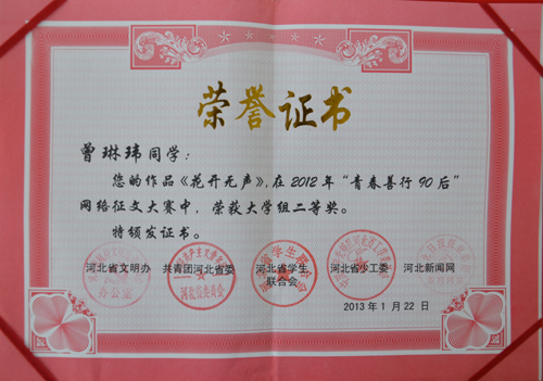 1月22日,从河北新闻网“青春善行90后”网路征文大赛组委会获悉,我院经济管理系工商管理专业1107班学生曾琳玮的作品《花开无声》荣获网络征文大赛大学组二等奖。