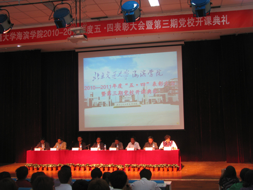 弘扬“五四”精神,激励青年学生不断挑战自我、奋发成才,我院团委于2011年5月6日下午在学院中心报告厅隆重举行了五四评优表彰大会暨第三期党校开课典礼,并取得圆满成功。学院执行院长王大勇,党委书记张平之,副书记、副院长张长铎,副院长贾怀义、吴子成、周俞波,学生处孙文博处长在主席台就座,大会由孙文博处长主持。