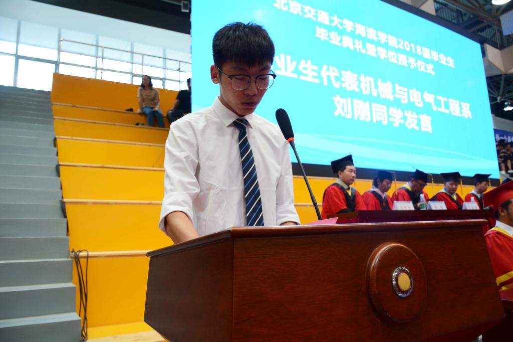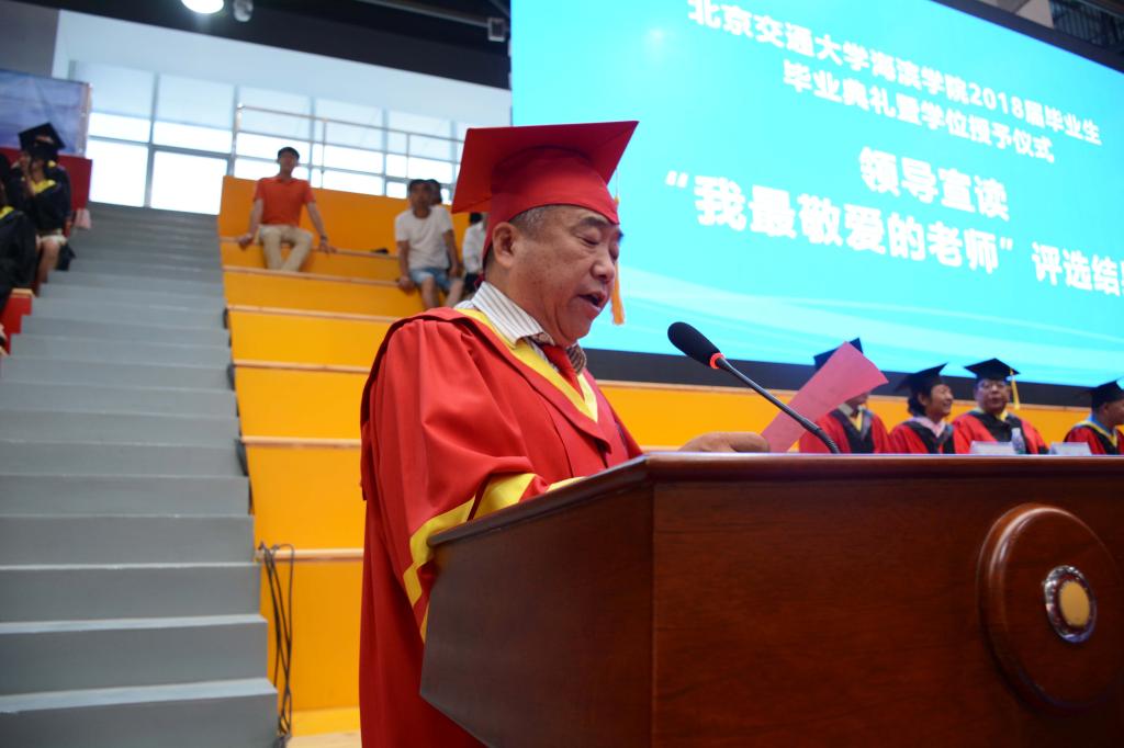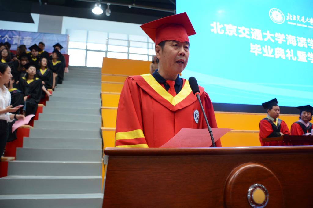 北京交通大学党委副书记、纪委书记郭海致辞,他代表北京交通大学向海滨学院2018届毕业生表示了真挚的祝福,并对毕业学子们提出希冀,希望毕业学子们牢记四个回归,学以成才,学以成人,不忘初心,牢记使命,以不变应万变,带着感恩的心从海滨出发,对社会做出自己的贡献。