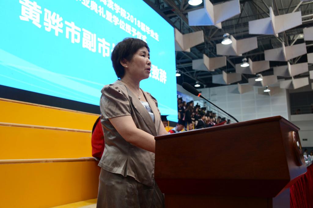 随后,张桂云副市长代表黄骅市委市政府向海滨毕业学子表达了她真挚的问候。她说:四年前,你们离开家乡,来到黄骅这座小城;四年后,你们怀揣梦想,走向属于你们的未来;在海滨的这四年,你们给黄骅带来了青春的力量和年轻的活力,在梦想的道路上,希望你们不断开拓自己的成长之路,在成长路上以梦为马,不负韶华,千帆过尽,归来仍是少年。