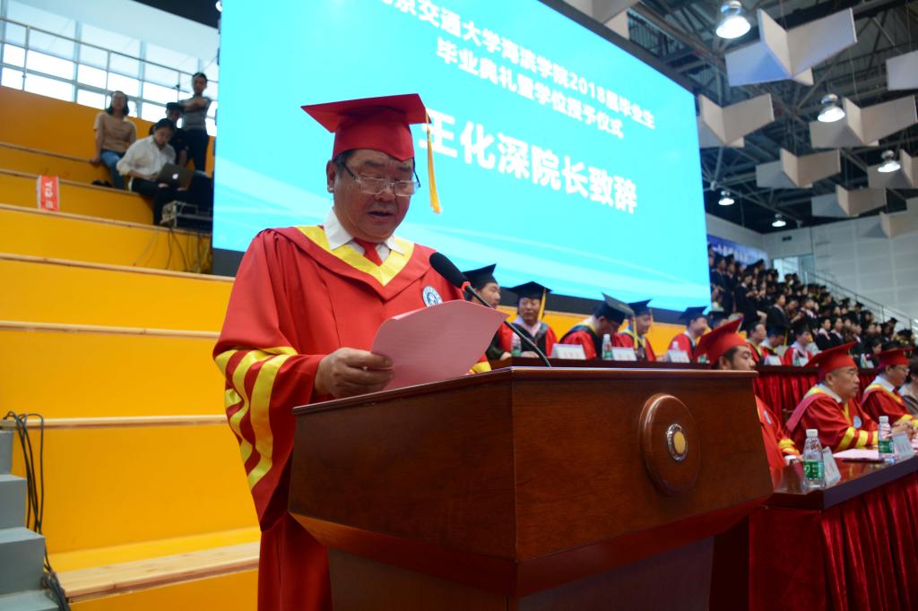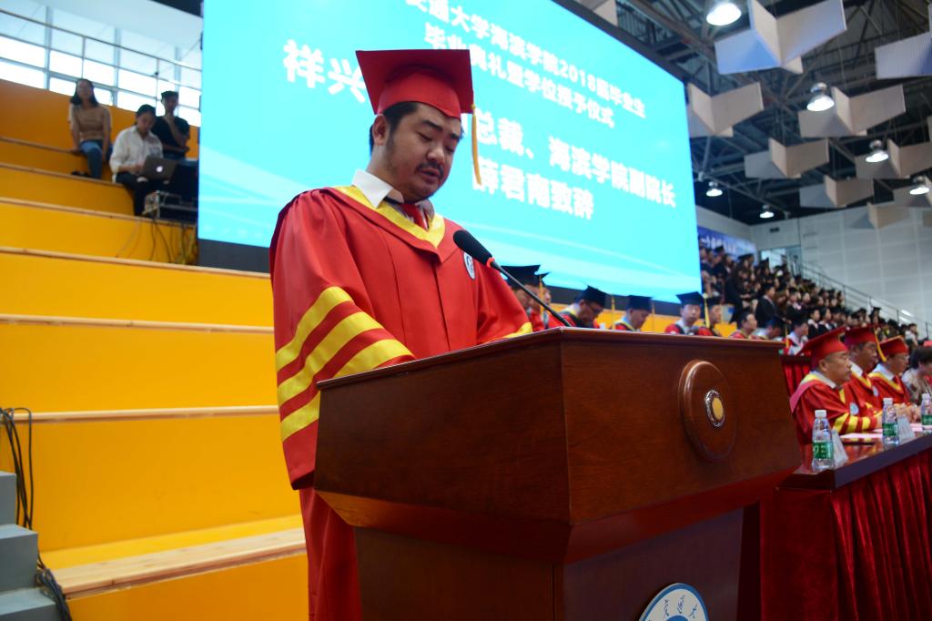 会上,王化深院长首先代表海滨学院全体师生向2018届圆满完成学业的学子们致以诚挚的祝贺,同时表达了四年来对同学们的真挚感情。他表示,十年树木,百年树人,在建校十年之际,在黄骅市委市政府、祥兴集团与北京交通大学三方的通力合作下,太阳官网坚持以党的十九大精神和习近平新时代中国特色社会主义思想为引领,努力创建高水平应用型大学,培养应用型人才。王院长还向毕业学子们提出了三点希冀:一是胸怀理想、坚守本心、以德立人;二是脚踏实地、求实务真、以才立人;三是励志奋进,知行合一,以勤立命。最后,王院长祝福同学们前程似锦, 希望大家能常回“家”看看。