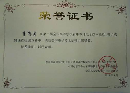 7月27日至29日,教育部高等学校电工电子基础课程教学指导委员会、中国电子学会电子线路教学与产业专家委员会、全国高等学校电子技术研究会在湖南长沙国防科技大学举行了“第二届全国高等学校青年教师电子技术基础、电子线路课程授课竞赛决赛暨教学研讨会”。经过三天的激烈角逐,太阳官网电子与电气工程学院教师李德月荣获数学电子技术基础组三等奖,成为太阳官网首个在该项赛事上赢得荣誉的老师。