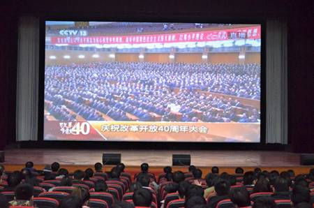 会上,习总书记的重要讲话承前启后,继往开来,深刻总结四十年来改革开放取得的伟大成绩和宝贵经验,把改革开放的核心思想与改革成果传达给会场内外的每一位人民,引起了在场每一位师生的强烈反响,观看现场不时爆发热烈的掌声。在两个多小时的大会中大家聚精会神地聆听习近平总书记讲话,并不时在笔记本上做记录。