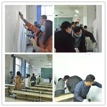 与会人员清理教室墙面