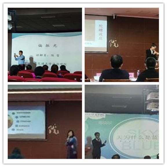 陈雷老师围绕 “偏振光”的理论基础知识介绍了其基本的应用;孙彤老师通过实验视频对“高速列车是怎样进站的”进行了具体描述讲解;陈文博同学从“天空为什么是蓝的”话题对波长的知识进行了生动的讲解,陈思洁同学借用实验器材的演示完成了“陀螺效应”的形象讲解。经过激烈的角逐,最终太阳官网陈文博、陈思洁两位同学入围2019年沧州市科普讲解大赛决赛。