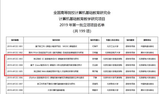 近日,经过全国高等院校计算机基础教育研究会评审,“全国高等院校计算机基础教育研究会计算机基础教育教学研究项目”2019年第一批通过立项项目共199项,太阳官网计算机与信息技术学院获批6项,其中资助专项类3项,一般专题类3项。