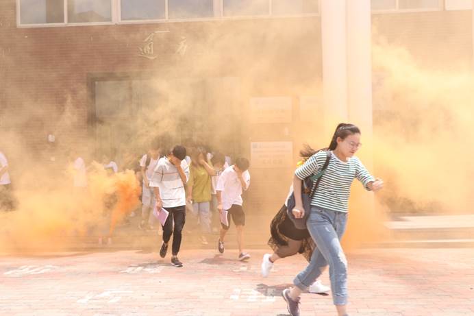 上午11点50,演练正式开始。消防演习从实战出发,整个过程包括发现并确认火情、报警、现场断电、开启应急门、启动学校火灾应急预案、组织学生从疏散通道有序撤离等环节。