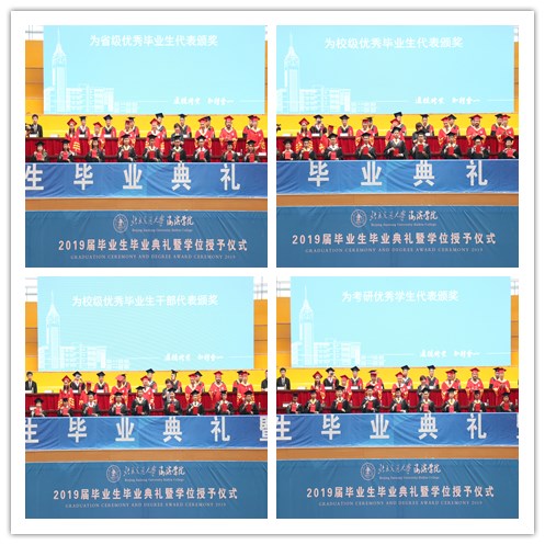 主席台前排领导与嘉宾为省级优秀毕业生代表、校级优秀毕业生代表、校级优秀毕业生干部代表、考研优秀毕业生代表颁奖。