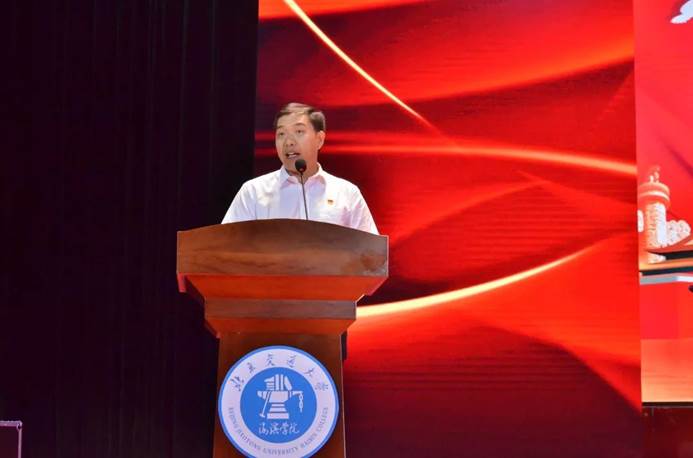 党委书记魏旺强代表学校党委,向受到表彰的先进集体和优秀个人表示热烈的祝贺并带领全体党员共同回顾了党98年的光辉历程。同时,魏书记表示,我们为自己是党的一份子而骄傲,为自己处于这个承前启后、继往开来的新时代而自豪。随后,他在讲话中对学校一年以来的党建工作成果进行了总结,提出了下一阶段的工作重点并对全体党员提出了殷切期望,即:坚持立德树人,加强思想政治工作,扎实做好意识形态阵地管理;强基固本,加强基层党建工作,充分发挥基层党组织战斗堡垒作用;严格标准,健全流程,提升党员发展质量,加强党员队伍管理;狠抓落实,筑牢校园安全防线,确保校园安全稳定。他希望全体师生党员不忘初心,牢记使命,以更加坚定的信心和更加饱满的热情开创学校事业发展的新局面,以优异的成绩向祖国七十华诞献礼。