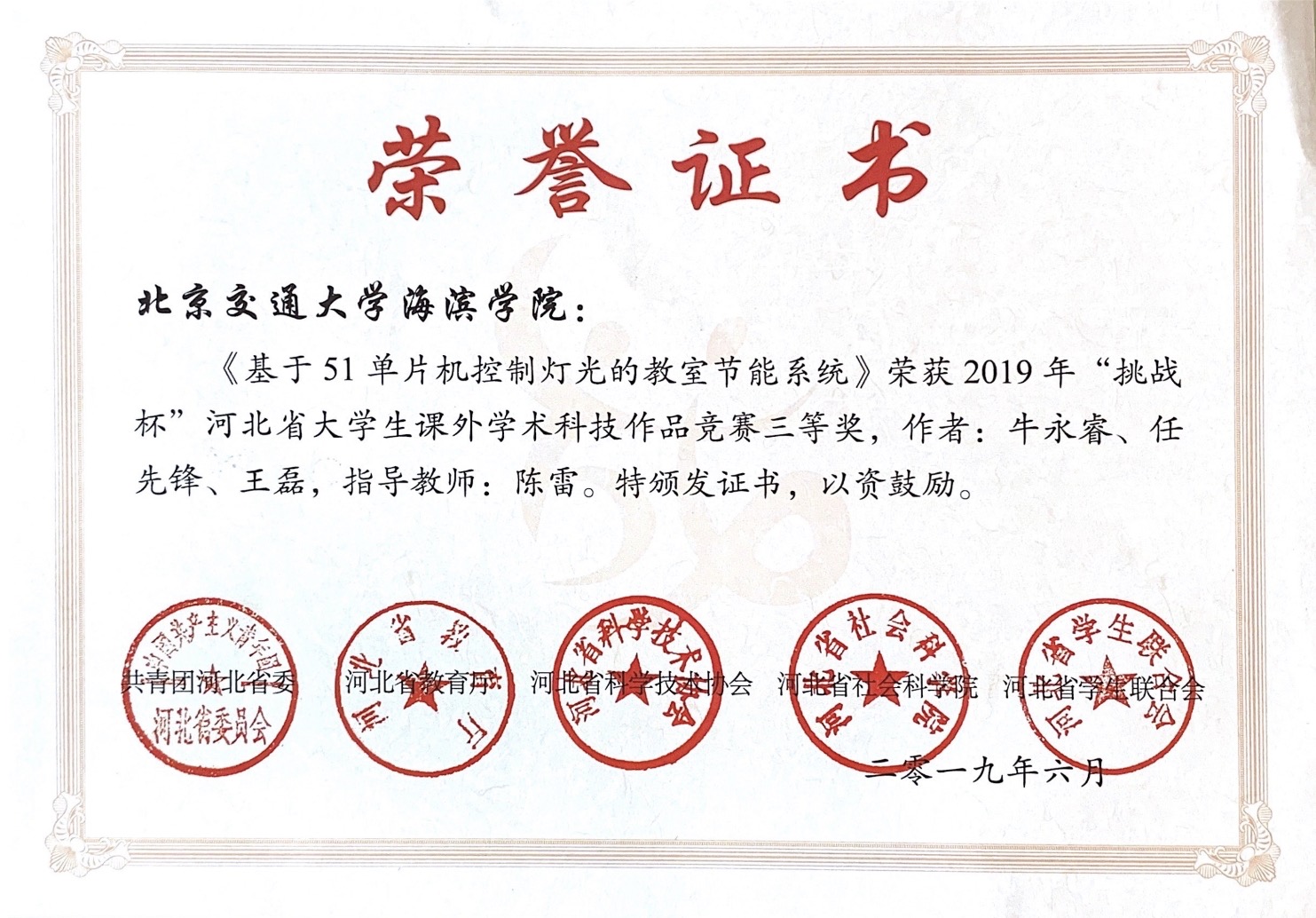 (一)2019年“挑战杯”河北省大学生课外学术科技作品竞赛三等奖