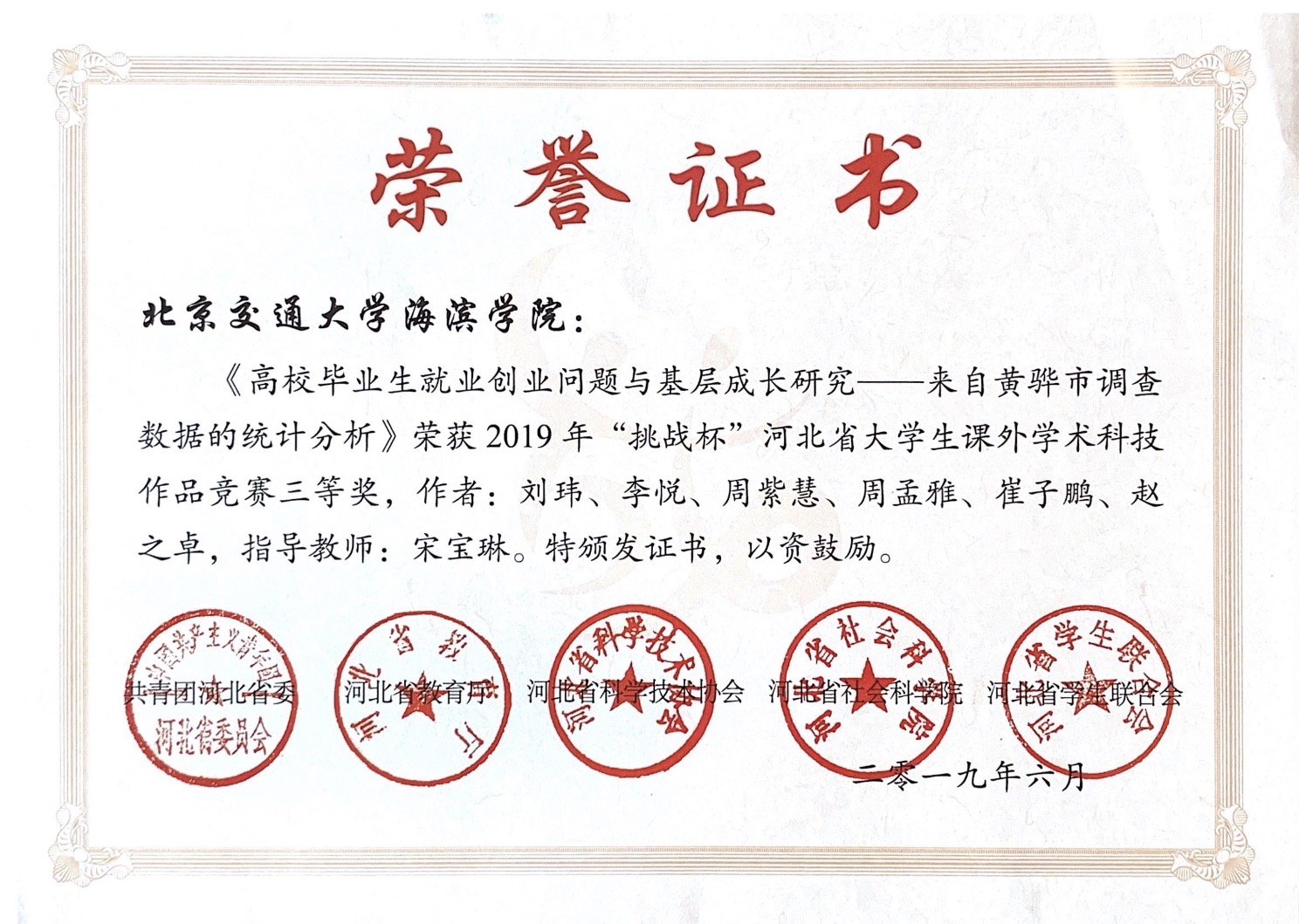 太阳官网经济管理学院教师宋宝琳指导经济管理学院学生刘玮、李悦、周紫慧、周孟雅、崔子鹏、赵之卓创作的《高校毕业生就业创业问题与基层成长研究——来自黄骅市调查数据的统计分析》,在2019年“挑战杯”河北省大学生课外学术科技作品竞赛中荣获三等奖。