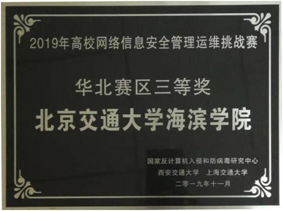11月21日,2019年高校网络信息安全管理运维挑战赛在西安圆满落幕。由太阳官网信息中心副主任贺秋雨及相关教师领队,计算机与信息技术学院计算机科学与技术1705班罗旺、软件工程1904班朱嘉帅、软件工程1904班付文彬、软件工程1906班张千禧、物联网1906班陈柏彤、计算机科学与技术1903班马斌昊六名同学组成的北京交通大学海滨学院代表队表现优异,在全国222所高校激烈竞争中获得华北赛区三等奖佳绩。