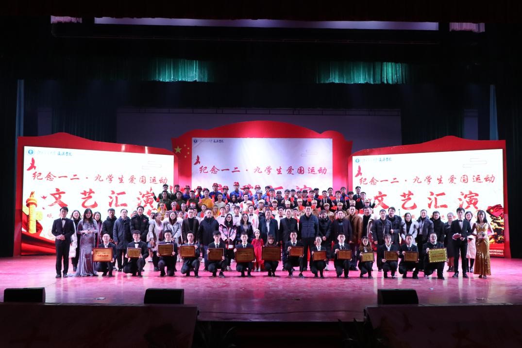 校长王化深为获得“砥砺七十载,奋进新时代”纪念一二·九学生爱国运动文艺汇演一等奖的获奖学院颁奖