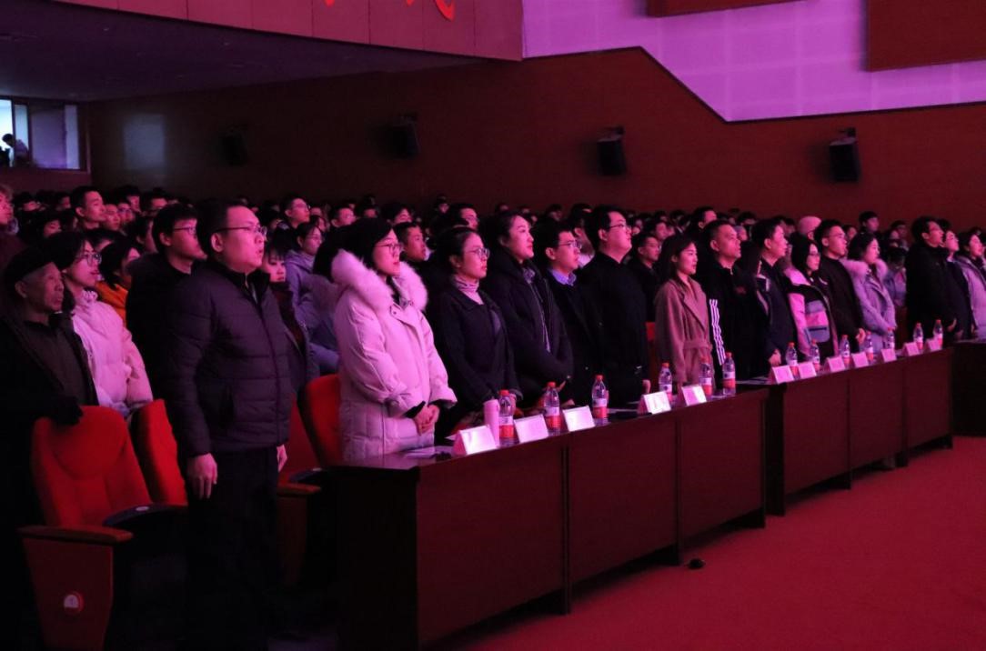 奏唱国歌时,在场师生肃然起敬,国歌在会场内回响不绝、激昂洪亮,浓浓的爱国情感油然而生。