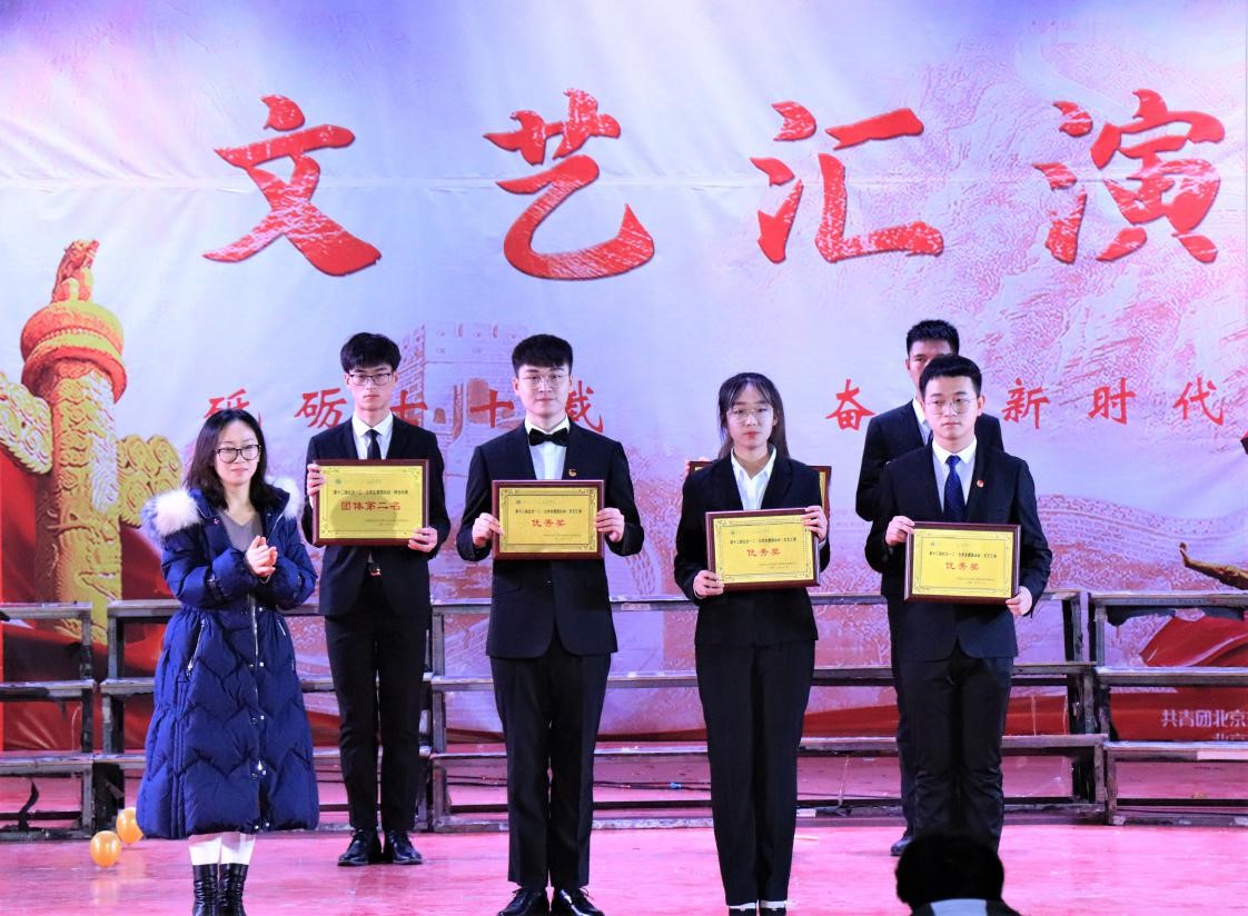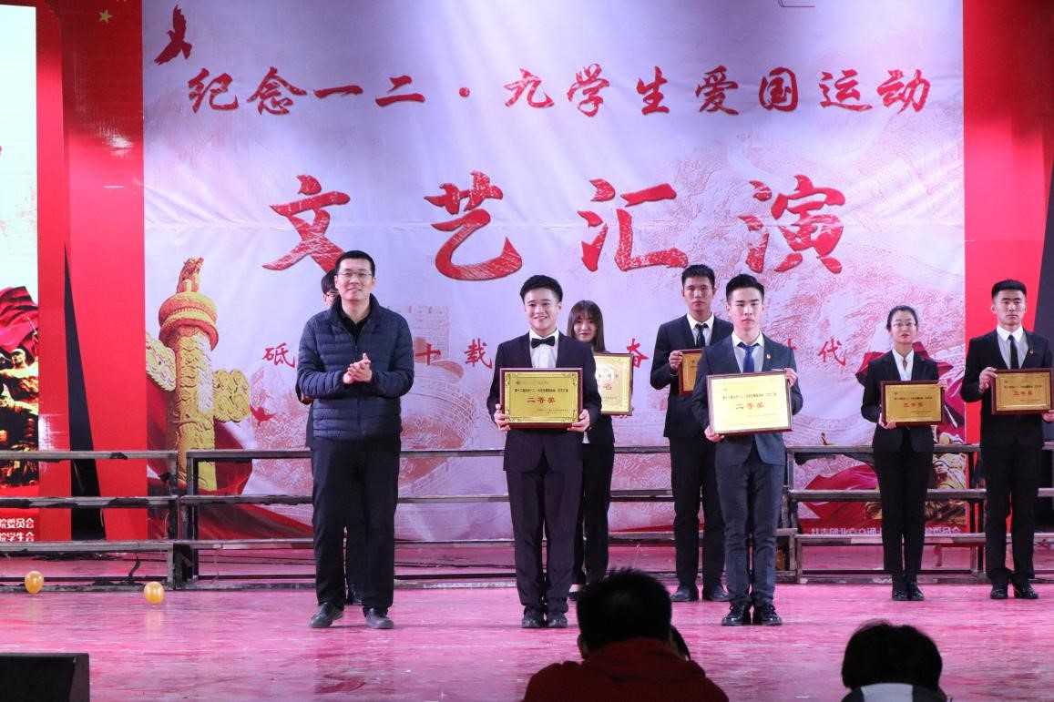 党委副书记魏炜为获得“砥砺七十载,奋进新时代”纪念一二·九学生爱国运动文艺汇演二等奖的获奖学院颁奖