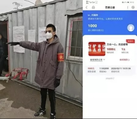 计算机科学与技术1706班的刘福朔正值寒假回乡,积极参加捐款活动,在村里捐款200元。此后,他又积极关注网上捐款活动,为武汉市慈善总会捐款1000元。他希望能够通过捐款的方式,为这场攻坚战献出自己的力量。同时,他还主动向村委报名,积极参加村里组织的抗击疫情志愿者服务活动,对来往车辆进行登记检查。