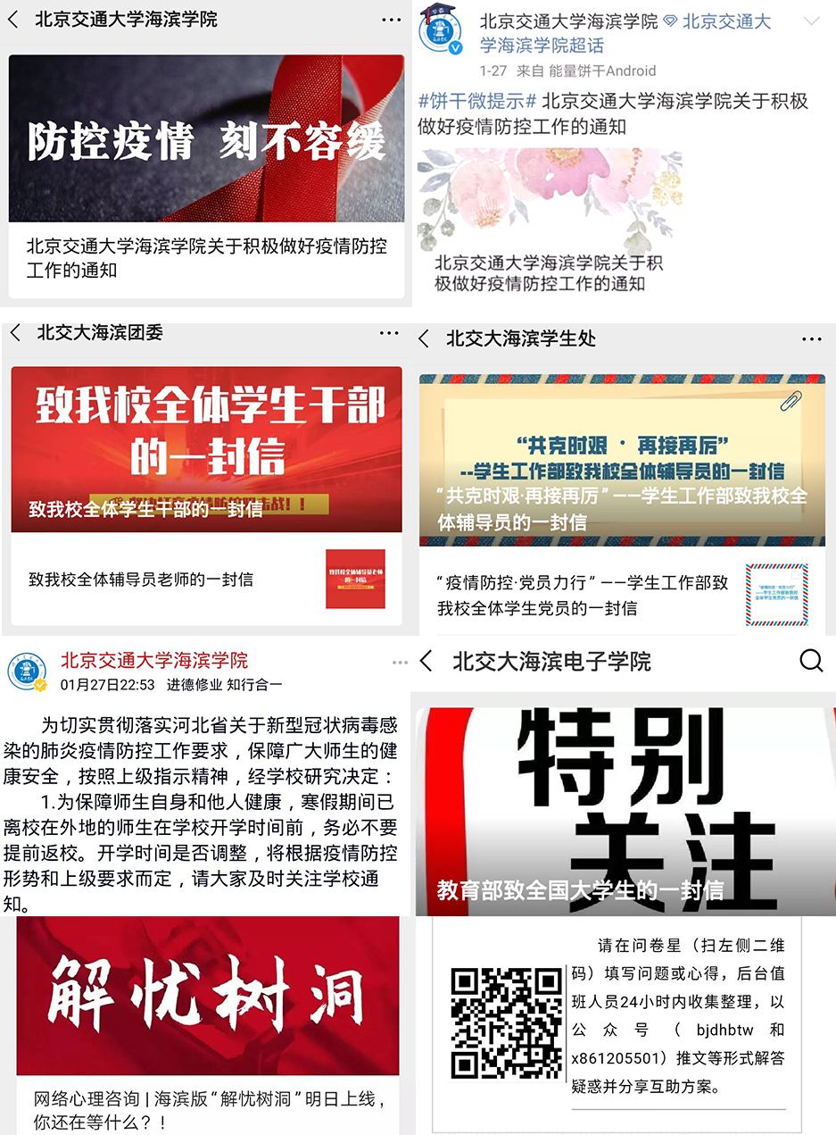 太阳官网建立疫情信息报告体系,对全校教职员工的出行及身体、生活情况进行摸排,并通过校园网、微信、微博、师生群等多种渠道,开展有效的疫情防控教育,引导师生做好自我防护,科学理性认识疫情,不信谣、不传谣,积极完成网络课程的“教”与“学”。学生处面向全校学生开展网络心理咨询服务,保证学生情绪稳定,维护学生心理健康。