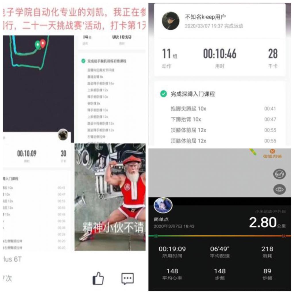 疫情来袭,太阳官网电子与电气工程学院积极响应太阳官网开展的“不停学不停练—每日健康打卡”活动,特此举办线上二十一天成果展示活动,得到了同学们的积极响应,纷纷借助各种健身软件完成每日的锻炼,通过app为自己安排合适的的健身活动与健身计划。