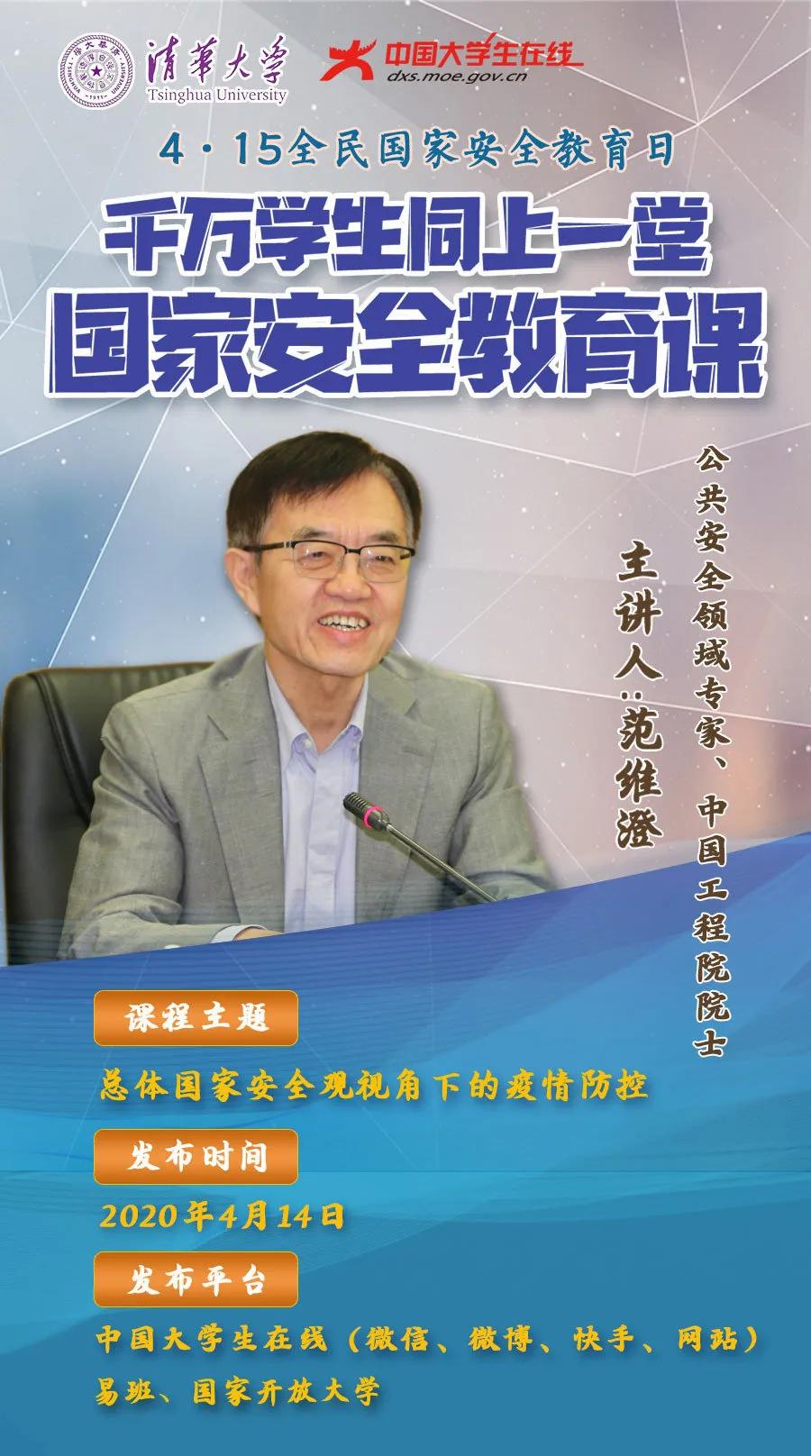 教育部邀请公共安全领域专家、中国工程院院士范维澄教授为我们解读、主讲《总体国家安全观视角下的疫情防控》高校公开课。同时,中国大学生在线官方微博等平台将于4月14日早上10:00同步上线课程,同学们可以在线观看学习。