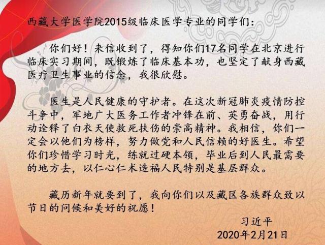 在藏历新年来临之际,中共中央总书记、国家主席、中央军委主席习近平2月21日给正在北京大学首钢医院实习的西藏大学医学院学生回信,肯定他们献身西藏医疗卫生事业的志向,勉励他们练就过硬本领、服务基层人民,并向他们以及藏区各族群众致以节日的问候和美好的祝愿。